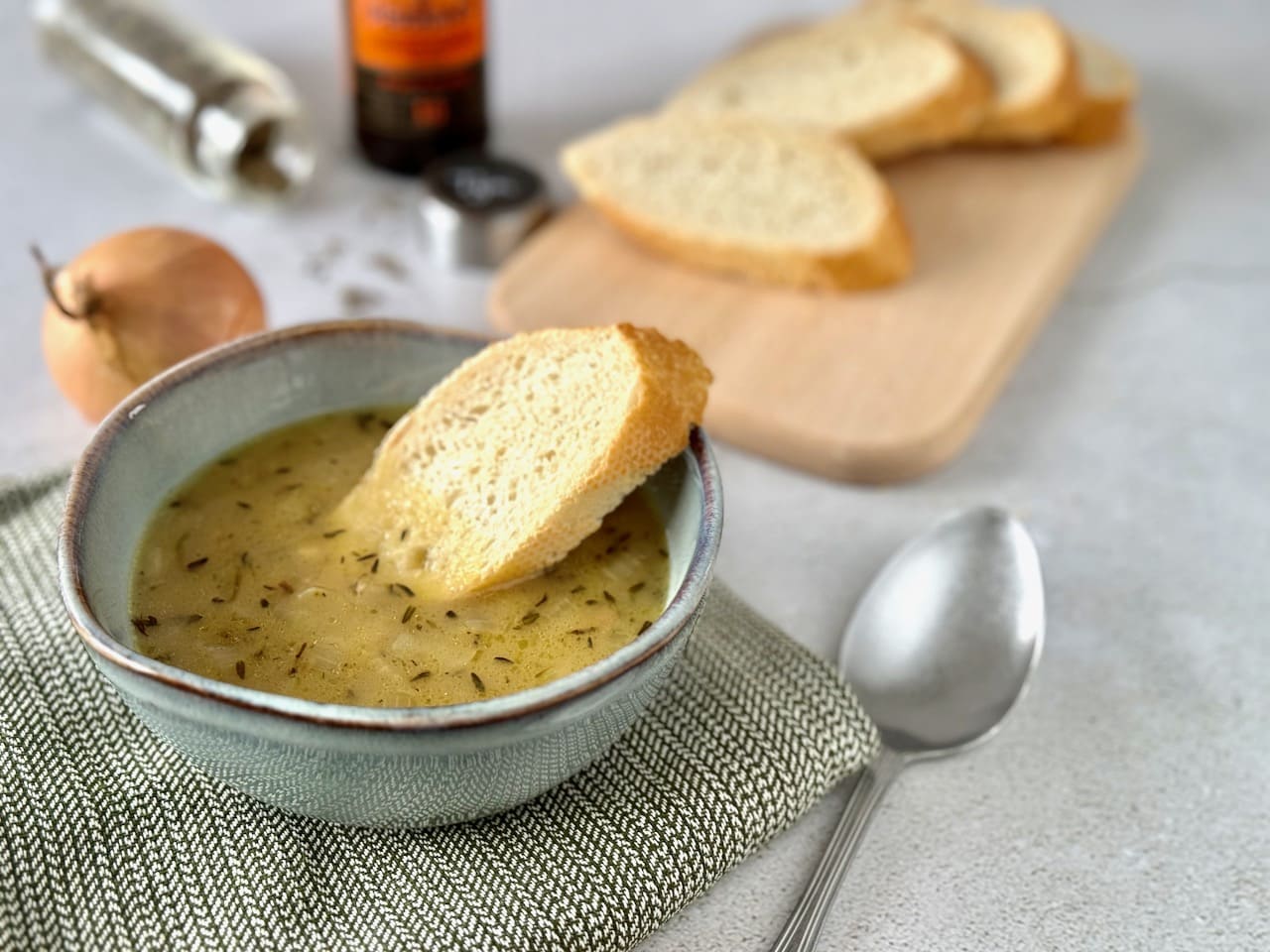 Voor dit uiensoep recept heb ik gekozen voor het binden van de soep. Er zijn ook andere recepten die een heldere uiensoep geven, en dat is ook zeker lekker. Ik ben echter dol op gebonden soepen vandaar de toevoeging van bloem om deze soep lekker dik te maken. Dit principe wordt ook gebruikt in het recept voor Franse uiensoep. Alleen die wordt dan ook geserveerd met een sneetje stokbrood met kaas. Dat kan jij natuurlijk ook doen, ik heb het deze keer simpel gehouden.