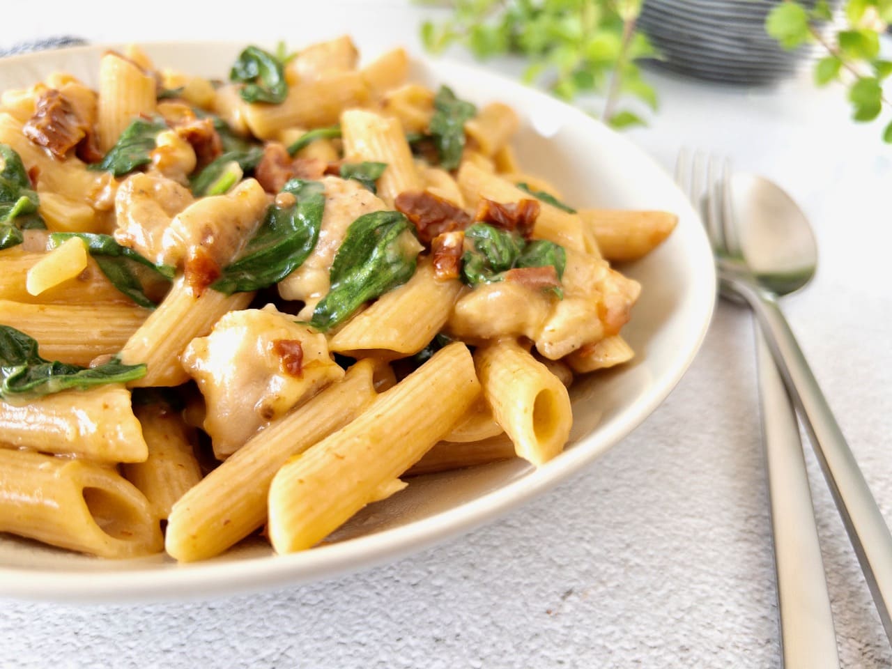 Een van mijn favoriete pasta gerechten is de authentieke spaghetti carbonara uit Rome. Ik maak hem regelmatig, maar ik ben ook altijd weer op zoek naar nieuwe pasta gerechten. Zo kwam het dat ik deze maand via de Foodblogswap wat mocht maken van de website van Nutmeg and Vinegar. Een geweldig kookblog van Maayke waar ze allerlei recepten deelt, maar vooral antieke recepten uit de 17e en 18e eeuw die ze aanpast naar de ingrediënten van nu. Op haar website trok echter niet een antiek recept mijn aandacht, maar een gerecht van kip en zongedroogde tomaatjes. Dit van zichzelf al lekkere recept inspireerde me om een versie te maken met pasta. En dat werd dus dit makkelijke en snelle recept dat je in een half uurtje op tafel hebt staan. Het is een heerlijke combinatie van romige kip, zoete tomaatjes, knoflook en spinazie. Je kunt dit gerecht maken met elke pastasoort die je lekker vindt, maar ik gebruik graag penne hiervoor.